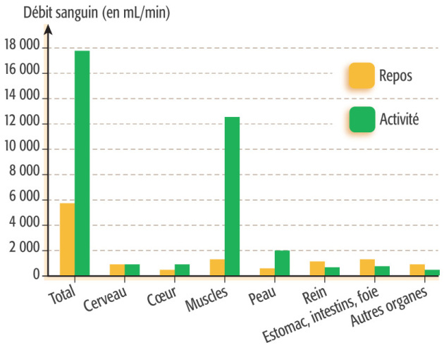 Au cours d'un effort, les muscles sont davantage sollicités. Ils consomment plus de dioxygène et de nutriments pour se contracter. Le débit sanguin est donc orienté préférentiellement vers les muscles pour subvenir à leurs besoins.
