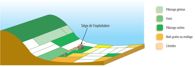 Oui, l'organisation de cette exploitation agricole correspond à celle décrite par madame Simon. On y trouve les prairies proches de l'exploitation pour les vaches en lactation, les prairies pour les génisses sur les pentes plus éloignées ainsi que les parcelles de production de foin. Les cultures de céréales sont dans la plaine.