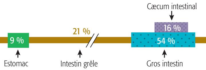 Les différentes parties du tube digestif du cheval se répartissent, en pourcentages, de la façon suivante :