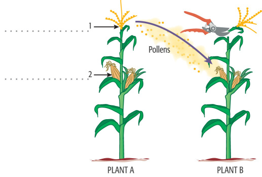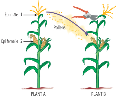 Plant B : c'est le parent femelle, son épi mâle a été supprimé et le pollen venu du plant A féconde son épi femelle.