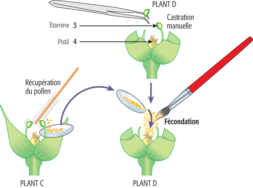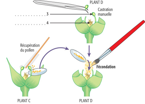 Plant D : c'est le parent femelle, ses étamines ont été supprimées et le pollen venu du plant C est déposé sur son pistil renfermant des ovules.