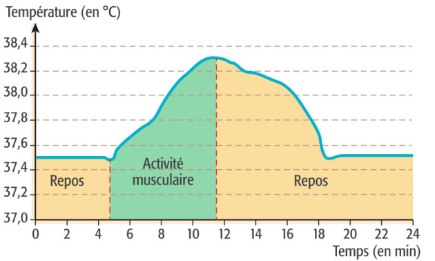 La courbe suivante montre la variation de la température du corps en fonction de la durée de l'activité musculaire.