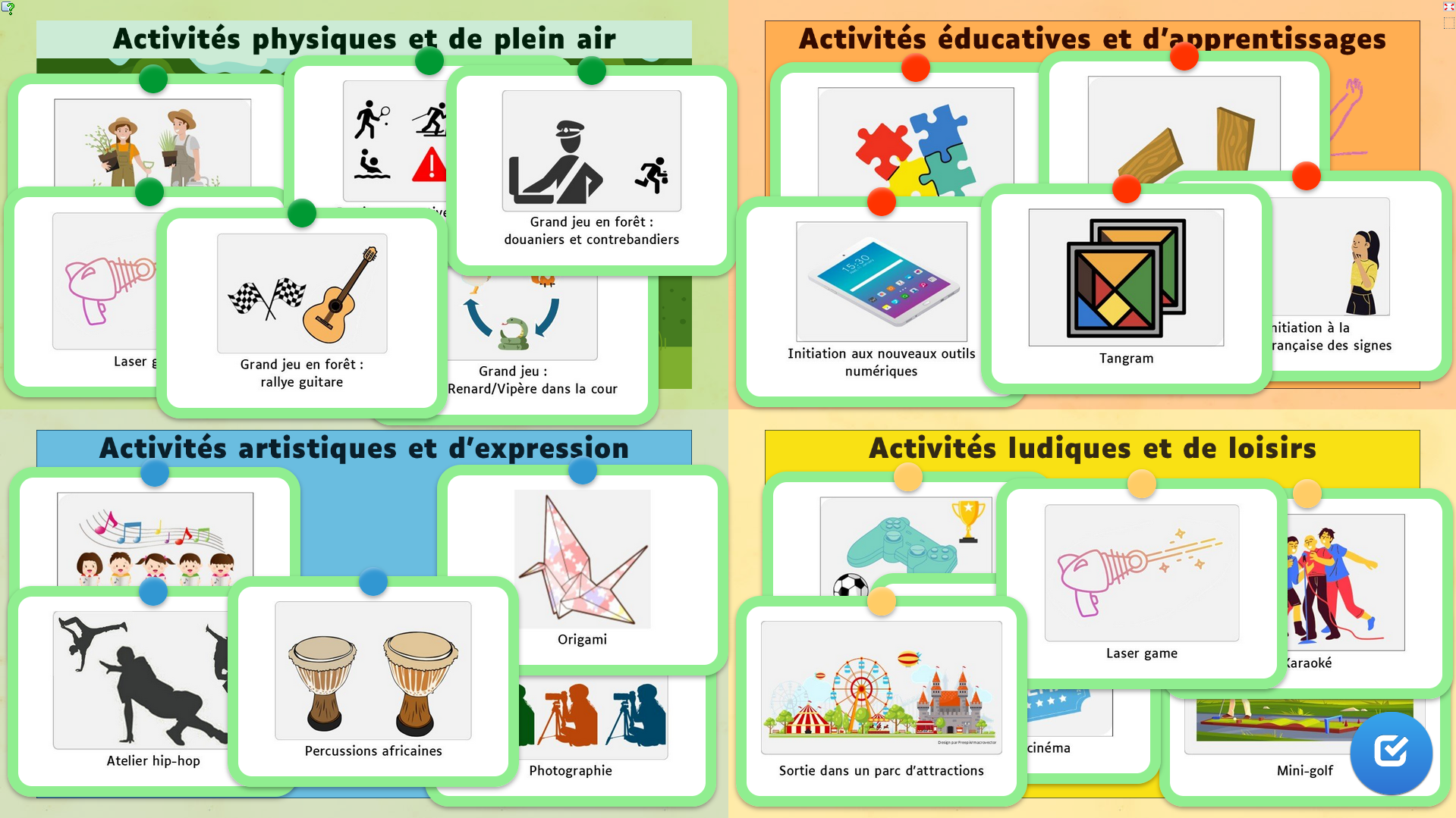 Voici des activités possibles adaptées pour certains publics. Déplacez les étiquettes dans la bonne catégorie d’activité.